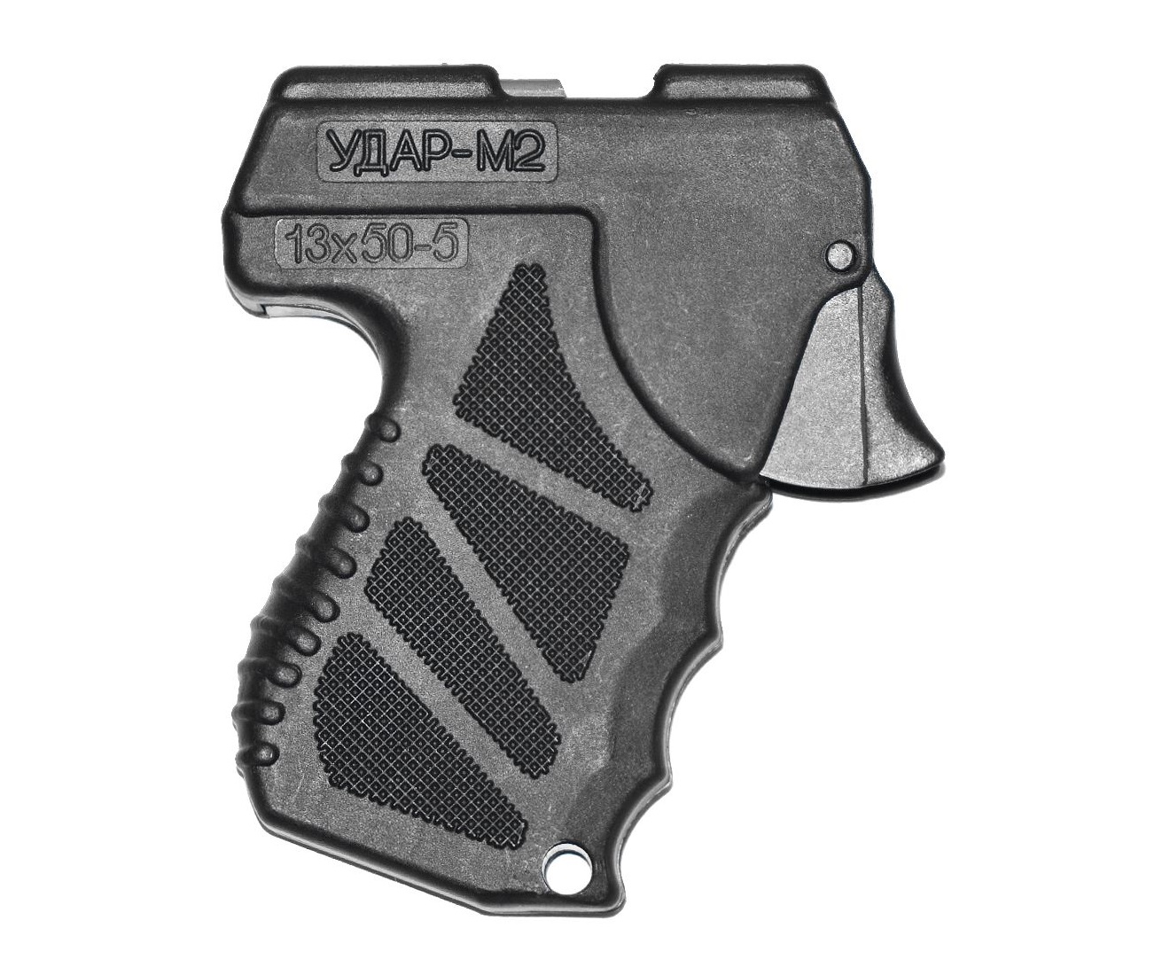 Это устройство самозащиты заряжается пятью одноразовыми баллончиками БАМ 13×50. При удачном выстреле в лицо нападающий на 10-15 минут теряет способность к агрессивным действиям, но необратимого вреда здоровью «Удар М2» не наносит. Использованный баллончик автоматически заменяется новым.