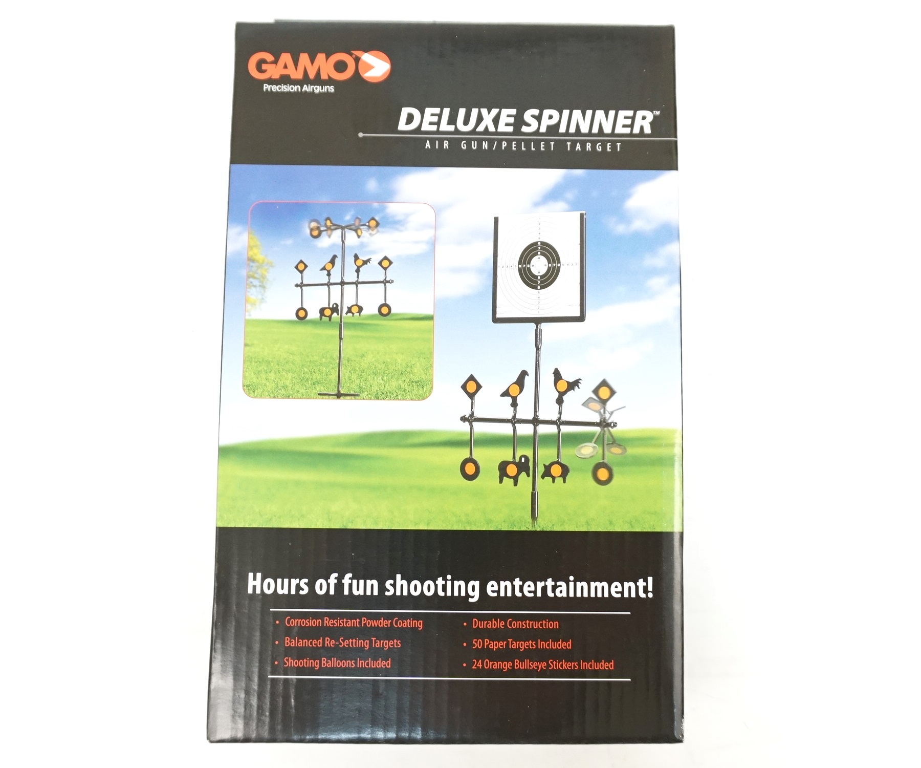 Мишень вращающаяся Gamo DeLuxe — набор вращающихся мишеней на стойке. Порошковое, антикоррозийное покрытие позволяет устанавливать мишень прямо на улице. Мишени выполнены в форме фигур и зверей с четким оранжевым кругом посередине. При попадании мишень проворачивается, таким образом, предыдущая становится в готовое положение, избавляя стрелка от лишних движений. Так же в верхней части возможна установка стандартной бумажной мишени.