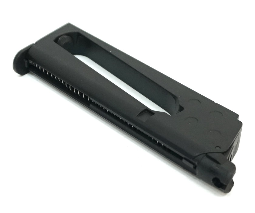 Магазин полноразмерный, т.е. в его корпусе располагается газовый клапан, отсек для размещения баллончика СО2, скрытый прижимной винт и подпружиненный толкатель шариков. Полноразмерный магазин добавляет реалистичности при его использовании.