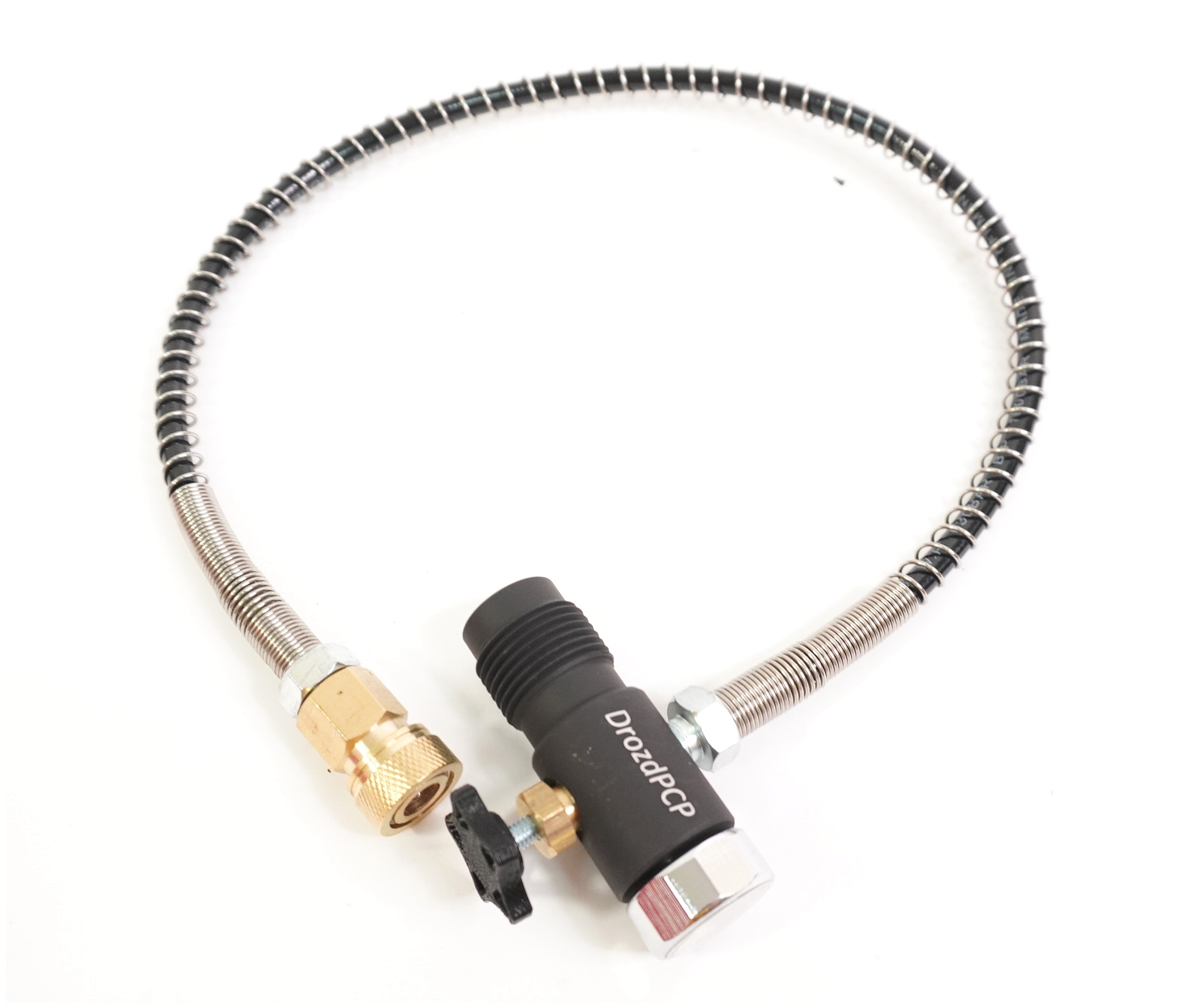 Заправочная станция – это аксессуар, который состоит из шланга с двумя концами. Один крепится к баллону, второй к резервуару винтовки. От утечки воздуха уберегают специальные резинки.